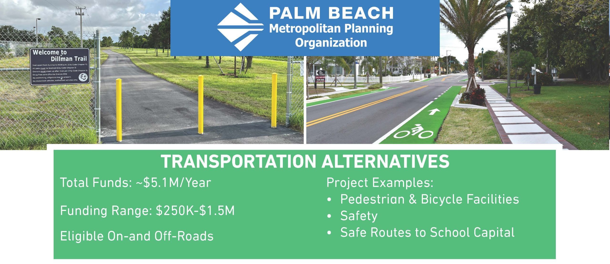 The purpose of the MPO’s Transportation Alternatives (TA) grant reimbursement program is to prioritize funding for active transportation projects for non-motorized users. This federal program, in coordination with the Florida Department of Transportation (FDOT), is an annual competitive application process where projects are submitted to the MPO and then ranked and prioritized for funding of approximately $5.1M annually. Eligible entities include local governments, regional transportation authorities, transit agencies, natural resource or public land agencies, school districts, local education agencies, and tribal governments in Palm Beach County. Click the “Program Overview” link below for more details about Eligible Project Sponsors, Project Eligibility, and when projects are prioritized and funded.